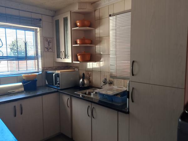 This well-maintained three-bedroom house offers comfortable living with a separate lounge, a fitted kitchen, and a bathroom with a convenient separate toilet. The house has a garage. It also has burglar bars, and is paved and fully walled.