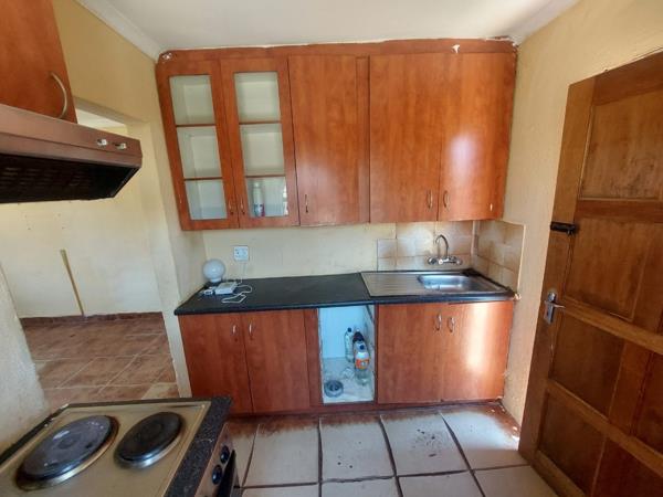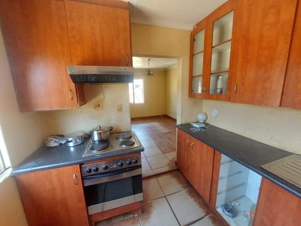 This sturdy brick-built home presents a functional exterior with a tiled roof and distinctive arched windows and front door, enhancing its kerb appeal. The property boasts a large, fully paved yard, ensuring low maintenance and providing ample parking for two vehicles. A private brick boundary wall offers a sense of enclosure, complemented by security bars on the windows for added peace of mind. The presence of two satellite dishes indicates connectivity. The interior features a comfortable lounge area and a functional kitchen, both benefiting from durable tiled flooring that extends throughout the home for easy maintenance. The kitchen is equipped with wooden cabinets, a built-in stove, oven, hob, and a range hood, providing essential amenities for daily cooking. Natural light filters through windows, some fitted with security bars, enhancing the living spaces. The residence comprises two well-proportioned bedrooms, offering private retreats for residents. A single bathroom serves the home, featuring standard fixtures. The expansive paved yard not only provides secure off-street parking for two vehicles but also offers a versatile outdoor space. A notable feature is the attached flatlet, presenting an excellent opportunity for additional income generation or accommodating extended family members, adding significant value and flexibility to this property. The property is secured with a brick boundary wall and security bars on windows, contributing to a safe living environment.