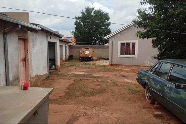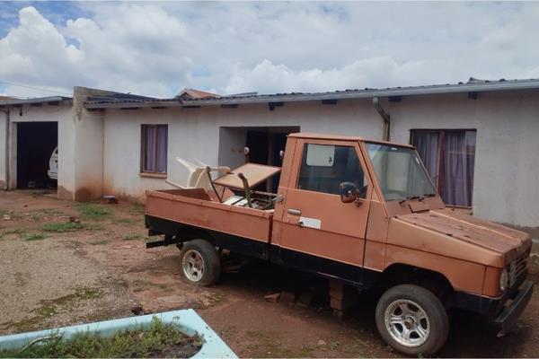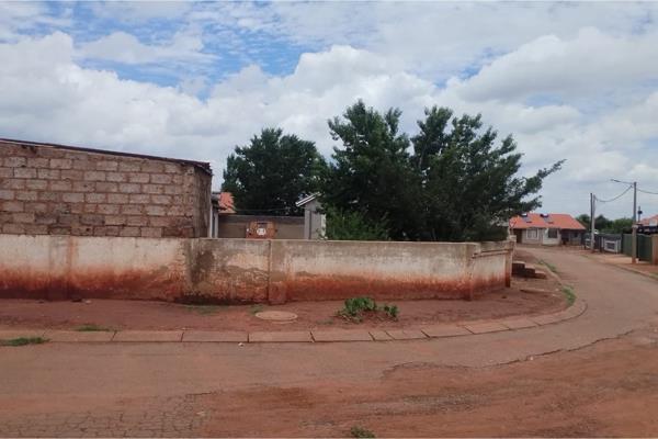 This large corner stand features 2 bedrooms, a kitchen, a dining area, 3 outside rooms, and a garage, and it is gated and walled with a Spaza shop.