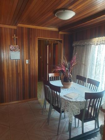 Inside, the home features a welcoming lounge area, characterized by a warm wooden paneled ceiling and ample natural light. A dedicated dining room, also adorned with extensive wood paneling, provides a cozy setting for family meals. The functional kitchen offers generous light wood-toned cabinetry and a double basin sink, with tiled walls for easy maintenance. While the interior design reflects a traditional aesthetic, it provides a comfortable living environment.