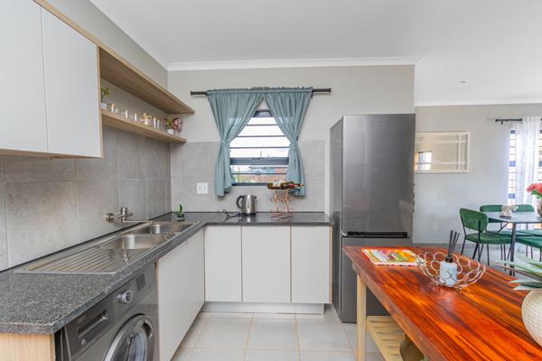 Open plan kitchen with build in cupboards, gas stove and electric oven