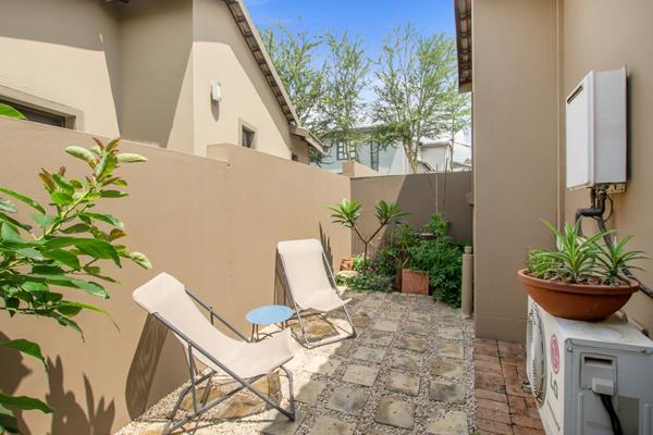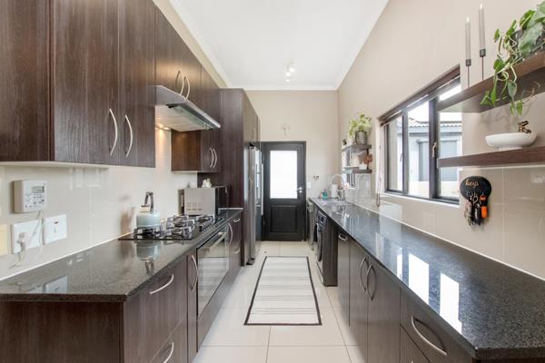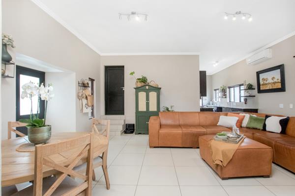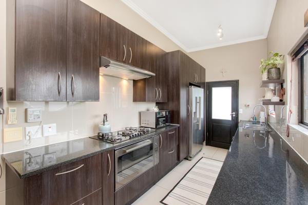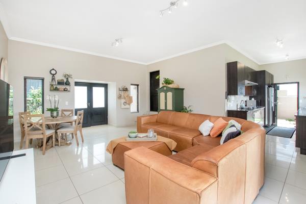 The open-plan living areas, featuring impressive 3m-high ceilings, include a dining room and lounge that flow seamlessly onto a covered patio with a built-in braai and sunny garden.