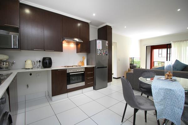 The open plan layout encompasses the modern kitchen with granite counter tops, space for a single door fridge and washing machine. Ample cupboard space is provisioned for storage.