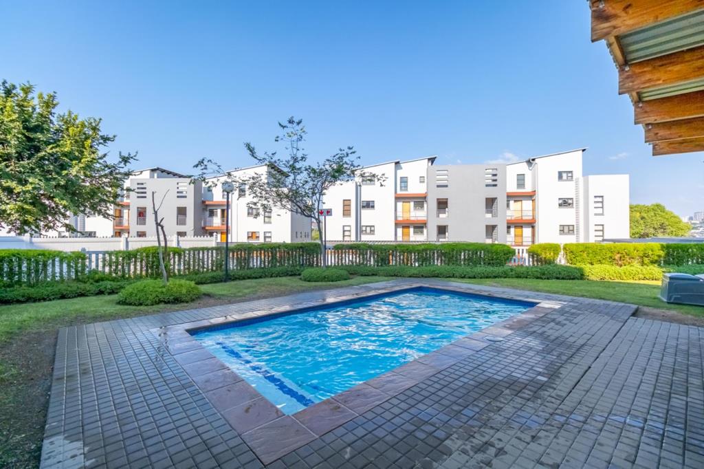 The Main Level: Contemporary Comfort The heart of this home is found on the main level, featuring a bright and airy open-plan lounge and dining area. This space extends naturally onto a private balcony, perfect for morning coffee or afternoon relaxation.The modern kitchen is a standout feature, blending form and function with sleek granite countertops, high-end finishes, and a smart design that accommodates a washing machine while maximizing prep space.Family & Guest Wing Conveniently located on this same level are two well-proportioned bedrooms, each offering ample cupboard space and large windows for natural light. These rooms are serviced by a stylish full bathroom, complete with both a bathtub and a showerideal for families with children or guests who prefer a long soak after a busy day.The Master Retreat: A Private Sanctuary The crowning jewel of this apartment is the secluded master suite located on the upper floor. This private sanctuary offers:Total Seclusion: Entirely separated from the downstairs living areas for ultimate peace and quiet.En-Suite Convenience: A modern en-suite bathroom featuring a clean, glass-framed shower.The View: A second, large private balcony that serves as your own personal lookout, offering unrivaled panoramic views over the Midrand skylinethe perfect spot for sundowners.Complex & Lifestyle Amenities Residents enjoy peace of mind and leisure right at their doorstep:Summer Ready: A sparkling communal pool area and clubhouse for entertaining.Secure Parking: Two dedicated undercover parking bays ensuring your vehicles are protected.Top-Floor Advantage: No neighbors above you, providing a quieter, more exclusive living experience.The Location: Barbeque Downs Centrally located between Sunninghill and Waterfall City, Barbeque Downs is a high-growth suburb perfect for young professionals and families alike. You are minutes away from the Mall of Africa, top-tier schools, and major highway interchanges. Quick Feature SummaryBedrooms: 3 2 downstairs, Master upstairsBathrooms: 2 Full family bathroom downstairs, Master en-suite upstairsLiving Space: Open-plan loungedining with private balconyKitchen: Modern design with granite topsParking: 2 Dedicated undercover baysExtras: 2 Balconies, Top-floor unit, Communal Pool