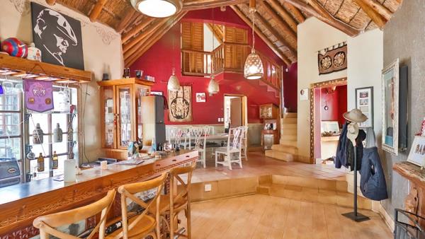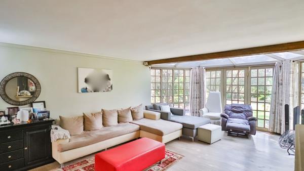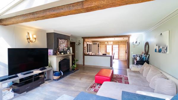 This lovely characteristic country-style home offers privacy and security and is tucked away down a pan-handle in a peaceful, secluded setting. Beautifully crafted, it offers the perfect blend of rustic farm-style charm and modern convenience. Designed to embrace indoor-outdoor living, the home showcases natural materials and expansive glasswork to create an atmosphere of light and warmth. Step through solid wooden doors with stained-glass detailing into spacious open-plan living areas, thoughtfully designed for both relaxation and entertaining. A dedicated entertainment wing features a built-in bar, wood-burning fireplace, and flows seamlessly onto a large undercover patio looking over the pool and landscaped tropical garden. Perfect for year-round gatherings with friends and family. The lounge area has lovely wooden floors.
