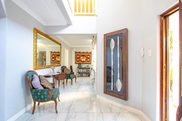 The covered patio takes full advantage of the peaceful surroundings, overlooking an Andy De Wet-designed pond and water feature, as well as the showpiece swimming pool with an underwater link to a smaller poolcomplete with cocktail seating for relaxing summer evenings.