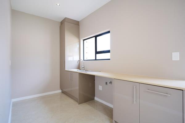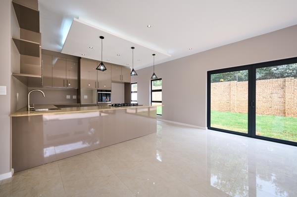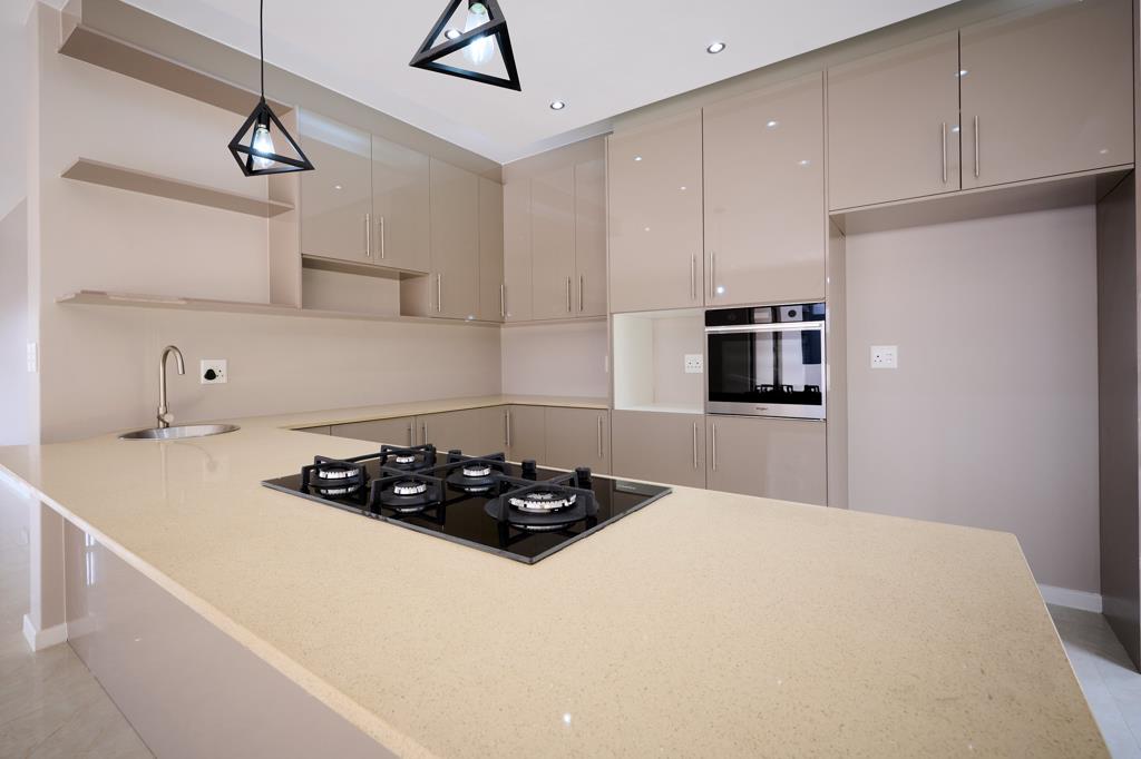 - Stylish kitchen with modern cabinetry featuring a gas hob, breakfast nook, space for a double door fridge and a separate scullery. The finishes are exquisite and must be seen.