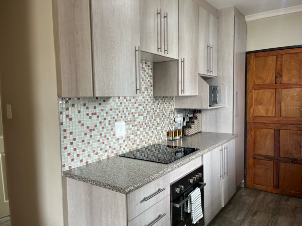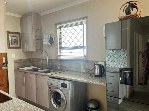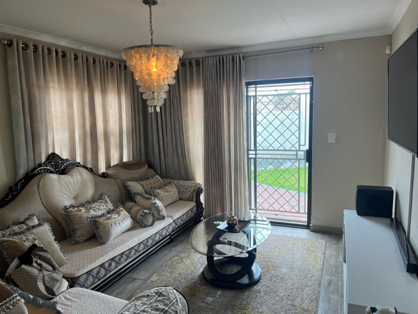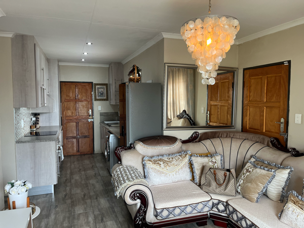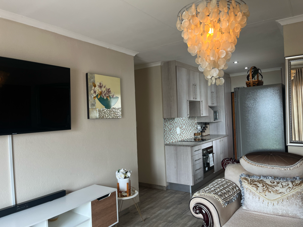 Discover this charming 3-bedroom, 2-bathroom home situated within a secure gated community in Blue Hills AH, Midrand. The residence features a thoughtfully designed open-plan living area, seamlessly connecting the modern kitchen. The kitchen boasts contemporary light wood-grain cabinetry, and integrated appliances including a hob, oven, microwave, and washing machine, ensuring both functionality and aesthetic appeal. The living space is adorned with wood-look tiled flooring throughout and a distinctive capiz shell chandelier, adding a unique touch.