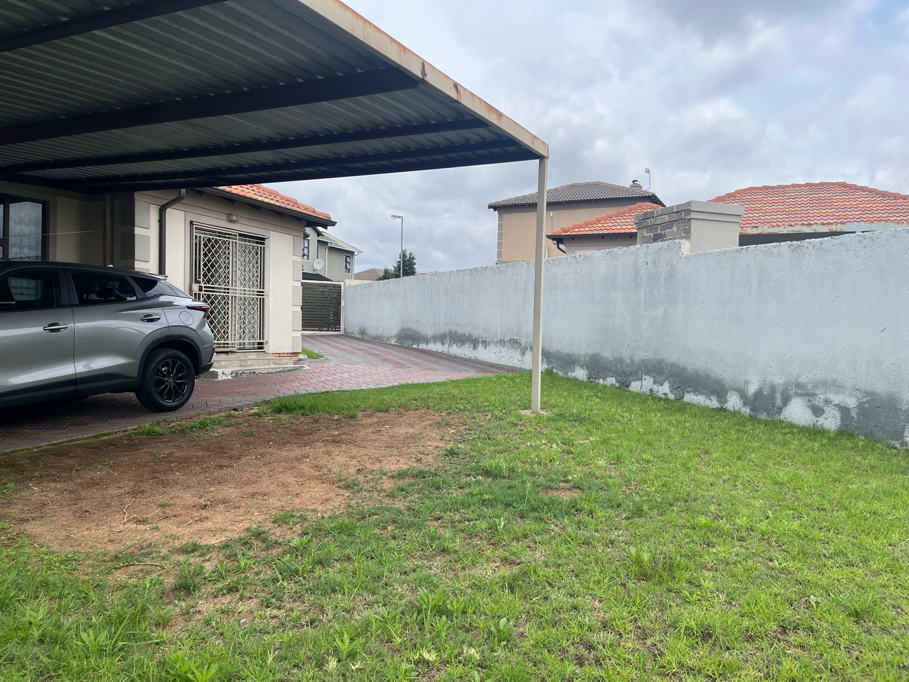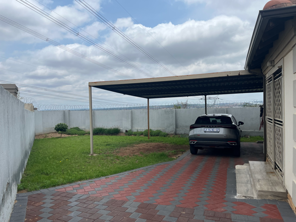Externally, the property presents a well-maintained appearance with a tiled roof. An extensive paved driveway leads to a convenient carport, offering shaded parking. The property is secured by high perimeter walls topped with razor wire, complemented by burglar bars and security gates on all access points. Residents benefit from 24-hour security and an access gate, ensuring peace of mind within this security estate. A small garden area and pet-friendly policy add to the lifestyle appeal of this compact home, perfect for those seeking a secure and manageable living space in Midrand, South Africa.