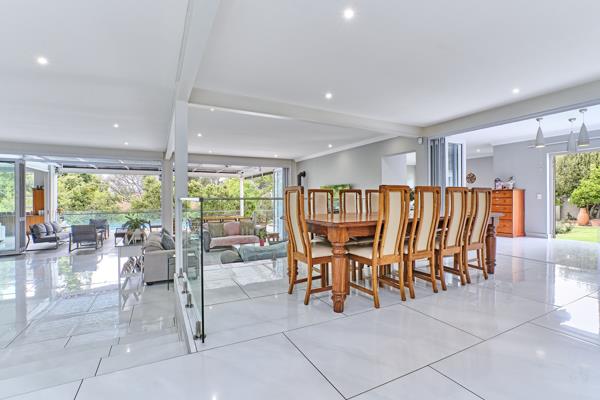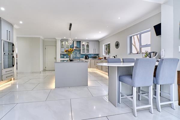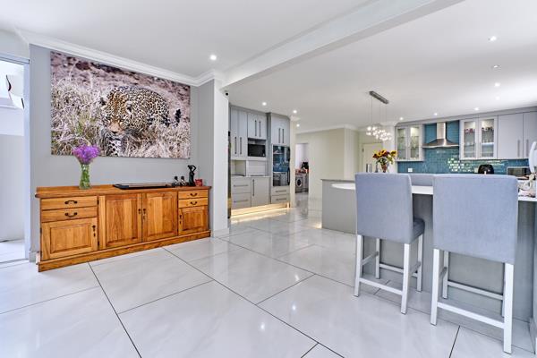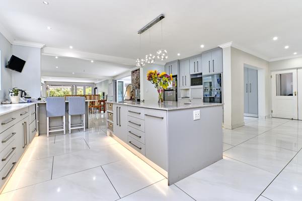 On opening the front door you are invited into an enormous, luxurious living area which seamlessly flows through to the huge patio, featuring pool and jacuzzi ideal for entertaining enthusiasts. The living area encompasses two lounges, both with fireplaces, one gas, one wood, an indoor barbraai area, the dining room and the gorgeous, modern kitchen, offering generous working space, over-sized centre island, separate laundry, walk-in pantry as well as a separate scullery. Light coloured Caesarstone and marble counter tops, high-end fittings, Smeg gas hob and electric oven as well as dual Defy ovens inspire creative meals. The kitchen also offers a casual counter-top eating area.