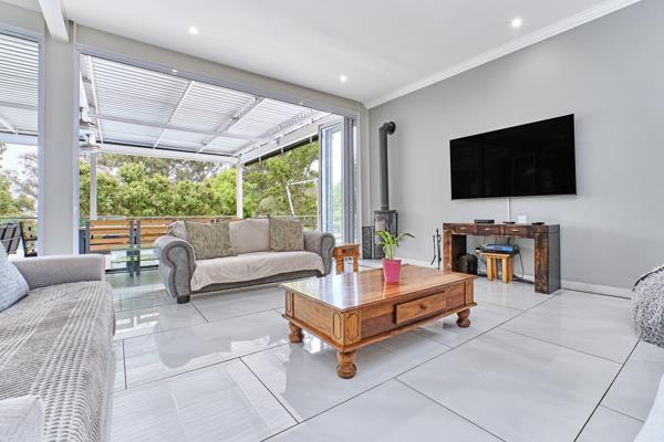 A lush, beautiful garden encompassing a lovely rose garden is fed by a borehole. The solar heated swimming pool leads down onto a fire-pit. The generous patio has automated retractable louvre roofing allowing sunlight in when desired. Solar power supplies ample alternate energy.