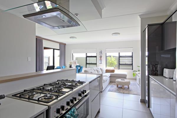 Modern island kitchen with a 5-burner gas stove and electrical oven. The cabinetry is modern with high quality finishings. There is a breakfast counter. Adjacent to the kitchen is a scullery and laundry. There is space for under counter appliances.