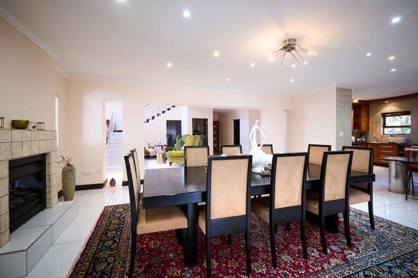 - Dining room fit for a king that will accommodate any sized dining table and elegantly opens out onto the covered patio with built in braai overlooking the crystal blue swimming pool and lush gardens.