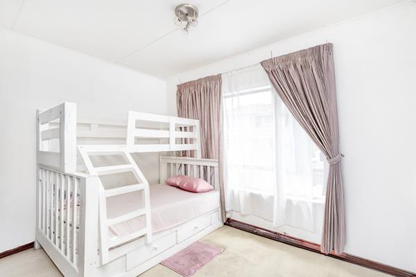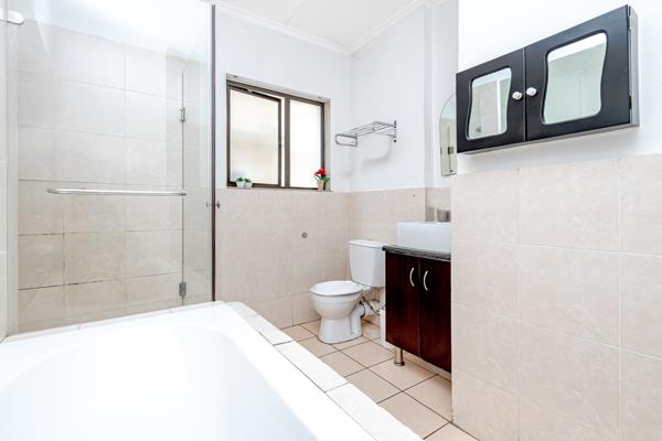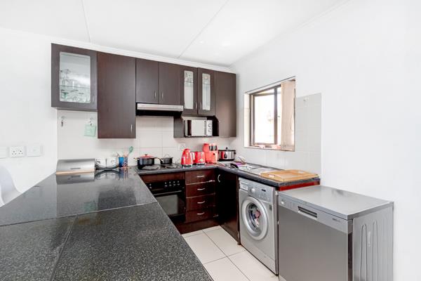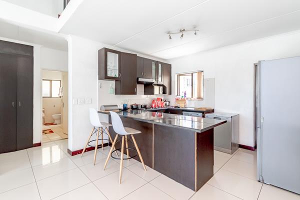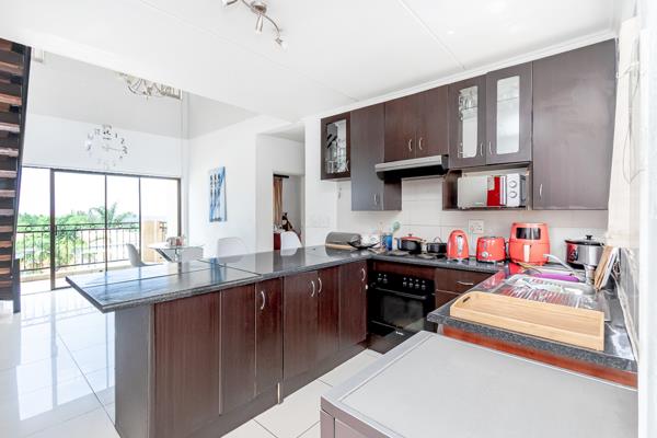 Spanning 122 m, the home features a spacious open-plan lounge and dining area that flows seamlessly into a well-designed kitchen fitted with built-in cupboards. The unit offers two balconies, ideal for morning coffee or evening relaxation, while the upstairs layout provides privacy and a sense of space. The main bedroom includes an en-suite bathroom, complementing two additional bedrooms with ample cupboard space.