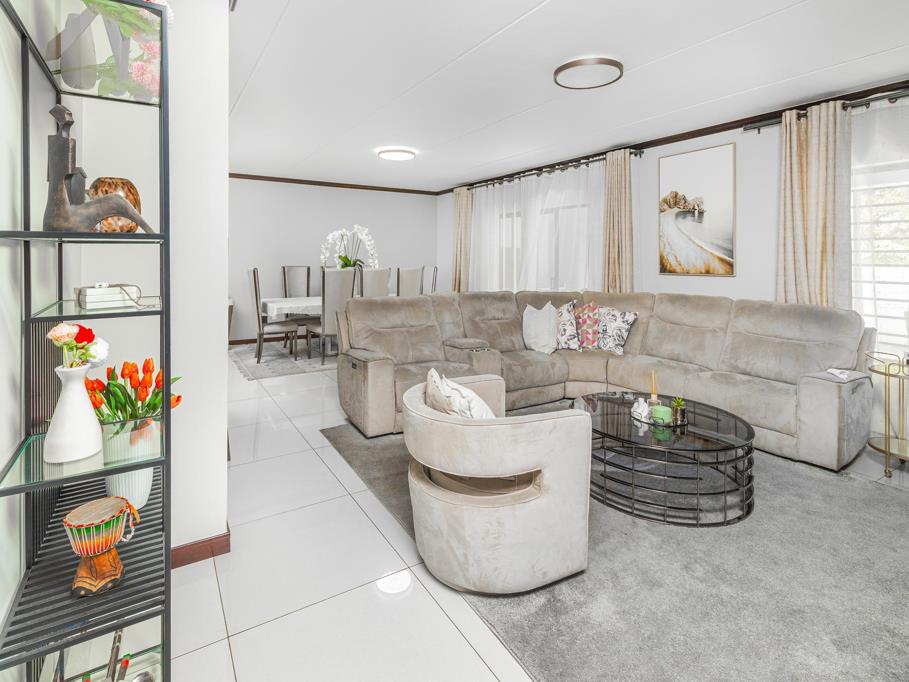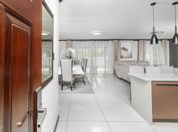 Elegant Living Spaces: The open-plan lounge flows seamlessly onto a covered patio with a built-in braai and kitchenette, complete with a sink. The patio opens to a spacious private garden, perfect for hosting or adding outdoor entertainment features.