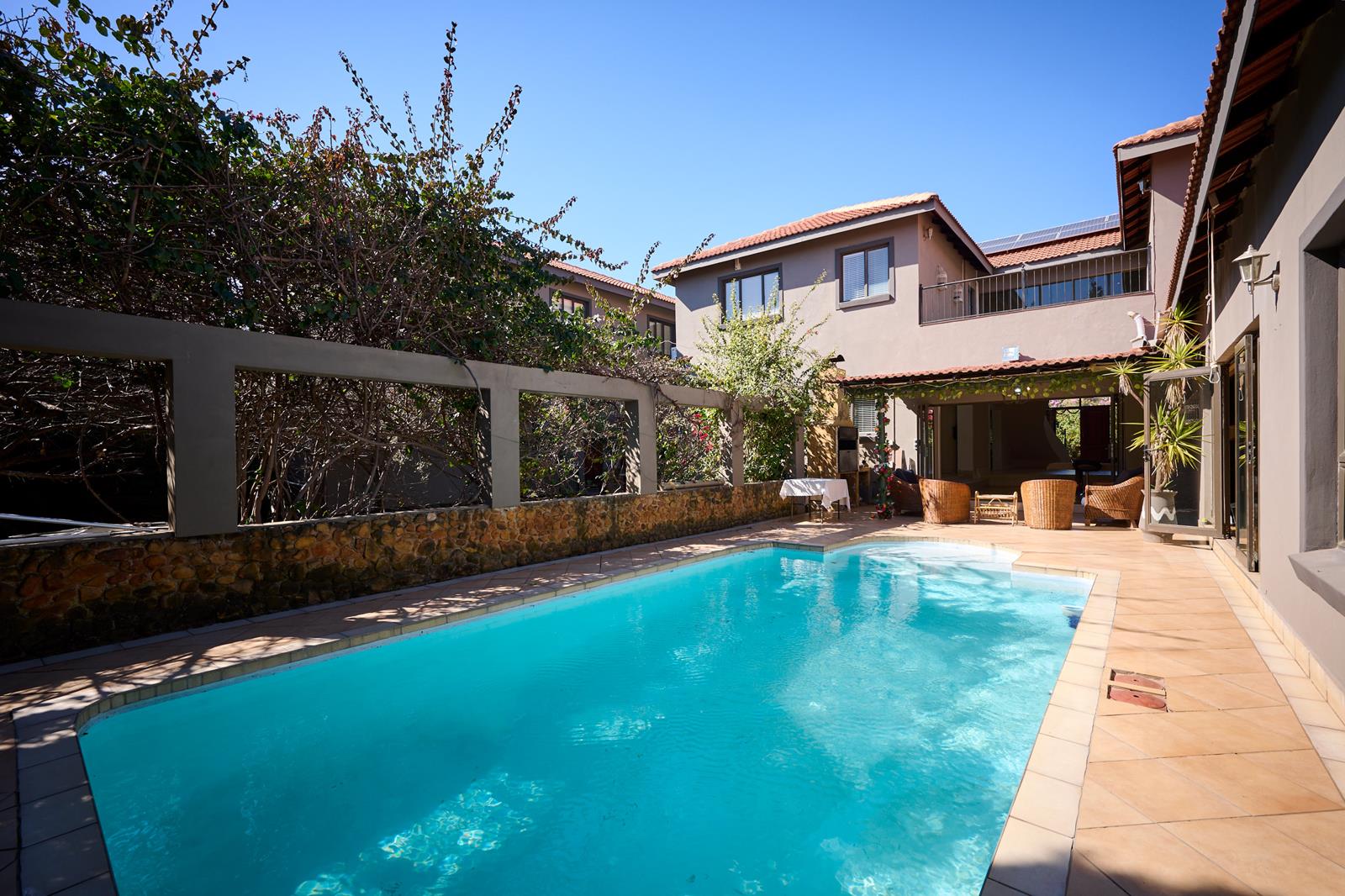 Outside, the covered patio is fitted with a built-in braai and overlooks a sparkling swimming poolperfect for year-round entertaining. Adjacent to this area is a dedicated bar and an enclosed wine room not climate-controlled, as well as a second sunny lounge, also with stacker doors that create a beautiful indoor-outdoor flow. Tucked just off this living space is a spacious downstairs bedroom, complete with an en-suite bathroom with shower, basin, and toiletideal for guests or extended family.
