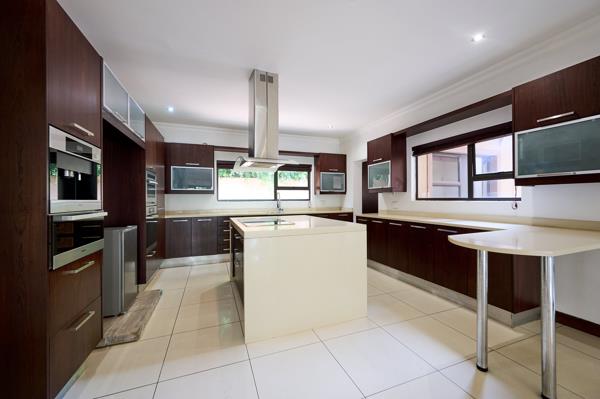 The well-designed kitchen is both stylish and functional, offering a central island, prep bowl, eye-level oven, microwave, coffee machine and space for a double-door fridge. The scullery provides ample cupboard space and accommodates multiple appliances.