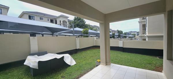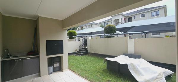 This modern ground floor apartment has 2 bedrooms with 2 bathrooms (main en-suite). The main bedroom has space for a dressing area and a reading couch. It has a glass partition between the bedroom and the bathroom. The en-suite has a full bathroom including tub and shower. The family bathroom has a large shower. The kitchen is designed with integrated appliances (Single Fridge/Freezer Combo and Dishwasher are Included). It has high gloss cupboards and Techni-Stone counter tops with sparkle pieces embedded in the granite. It also has 2 movable spice racks. The apartment has spacious open plan living area for a lounge and dining set. The living area leads out to a spacious covered patio fitted with a built-in braai and prep-bowl and in turn leads out to a 140 square metre garden. The estate has 24 hour access control security and a clubhouse with a pool.