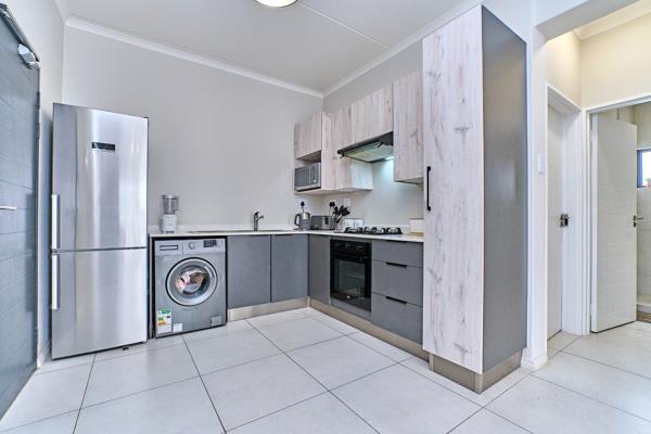 The heart of the home is the open-plan living area, where a spacious lounge blends effortlessly with a modern kitchen. The kitchen is both functional and elegant, offering ample cupboard space, a built-in electric stove, and a washing machine for ultimate convenience. This layout is perfect for those who enjoy a contemporary, connected lifestyle.