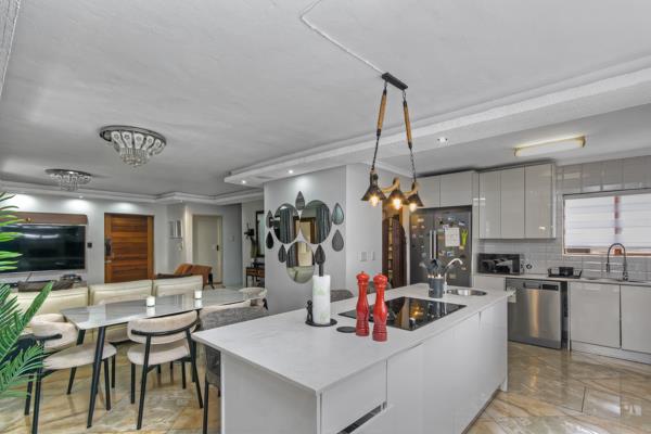 The main entrance leads you through to the open-plan lounge and dining area with a built-in wine cellar and smart lighting automation system to control lights and speakers for the lounge. The neat and spacious kitchen offers newly soft-touch cupboards, a combined gas and electric stove, space for 1 under-counter appliance and a double-door fridge, as well as a pantry with space for 2 appliances.