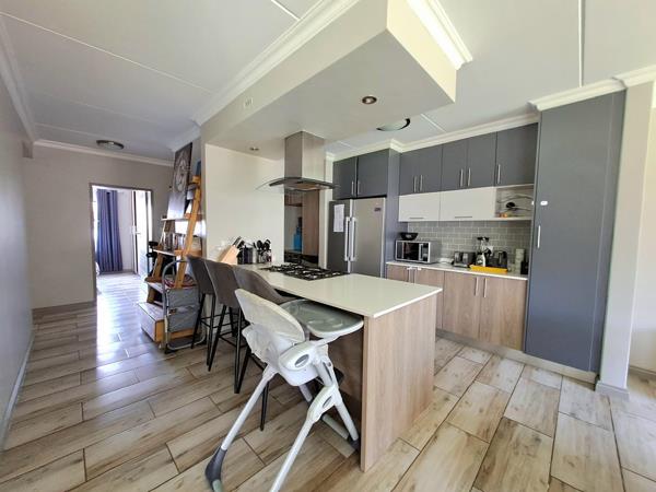 The large kitchen boasts plenty of cupboard space, a gas stove, space for a double fridge and accommodates two under-counter appliances.