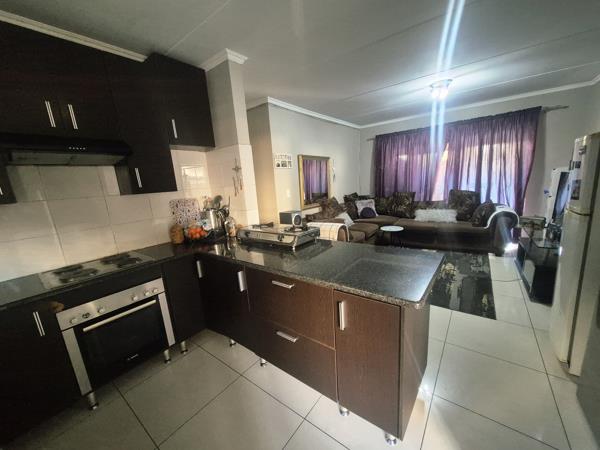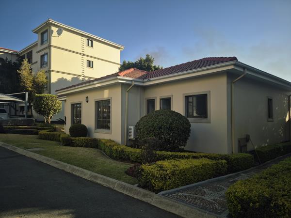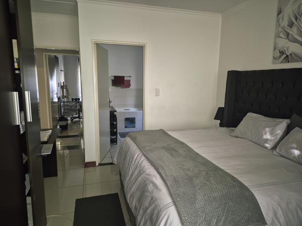 The apartment features three well-sized bedrooms with built-in cupboards, and two bathrooms, including a main en-suite. The open-plan kitchen is fitted with granite countertops and offers space for under-counter appliances. A spacious lounge and dining area flow out to a covered patio and private garden ideal for outdoor living or entertaining. The unit includes two covered parking bays, with ample visitor parking available in the estate.