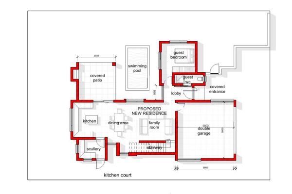 The Ground Floor will have a large open plan dining/kitchen/living room. A built in braai will be in the covered patio interlinking with the kitchen/dining area en overlooking he pool. Scullery will be separate and out of sight. A study/guest/helpers room on the ground-floor with own bathroom makes living convenient. A double garage perfectly placed on this concept plan allowing direct entrance to the house.