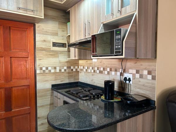 Open plan tiled living area onto a tiled lovely kitchen with melamine oak colour built in cupboards, 4 plate stove, undercounter oven and extractor fan and a blind.