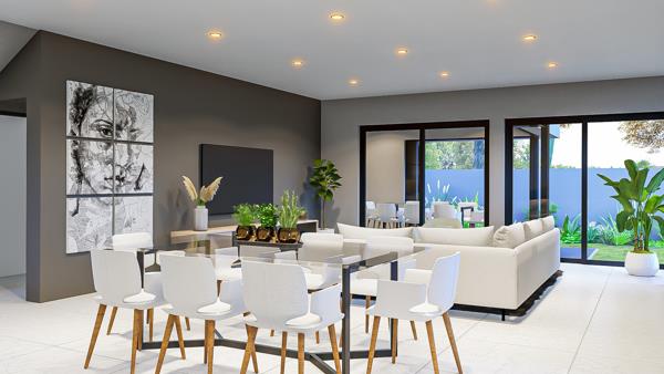 Spacious Living Area: The living area includes a dining room, lounge, open-plan kitchen, and a covered patio with a built-in braai. Enjoy stunning views of the garden, which offers plenty of space for adding additional amenities to suit your lifestyle.