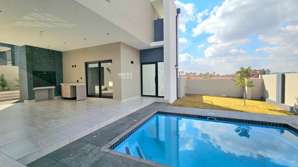 This stunning modern home is situated in the newly developed Fountainbrook Estate, adjacent to the prestigious Midstream Estates! This home features the following upstairs: Large main bedroom with a full en suite bathroom, as well as a spacious walk in wardrobe and access to a private balcony. 2 bedrooms with one full bathroom, with access to another balcony. Downstairs you will find your open plan living and dining area, modern kitchen with a scullery and separate laundry. Your entertainment area is covered and features a sparkling swimming pool. Also downstairs is your 4th guest bedroom or study, with a shower en suite bathroom and a guest toilet. This home also features three garages and a staff quarters.