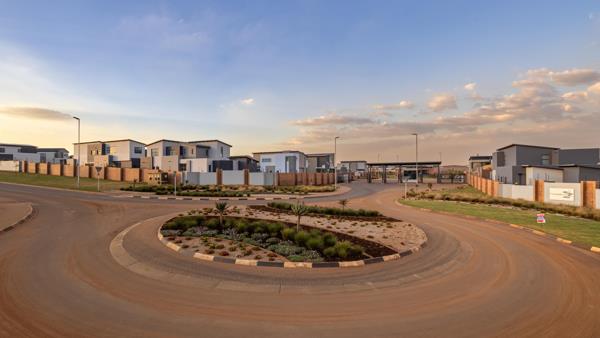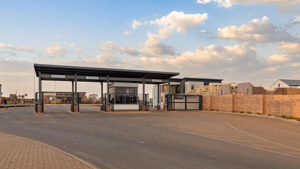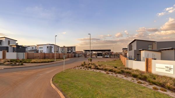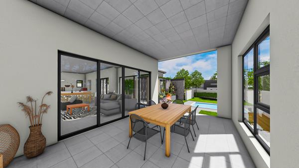 The double-door entrance leads into a spacious open-plan living area, featuring a lounge, dining room, and designer kitchen. The covered patio, complete with a built-in braai, extends to a firepit area and garden, with ample space to add future amenities.