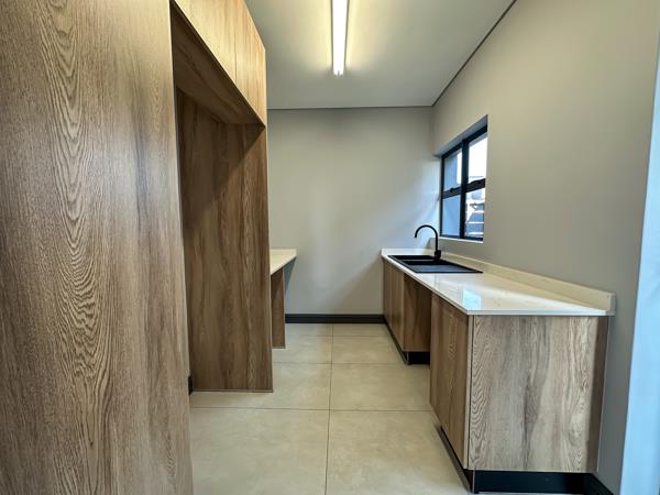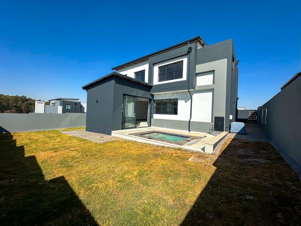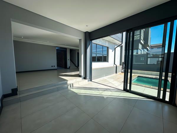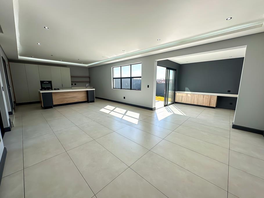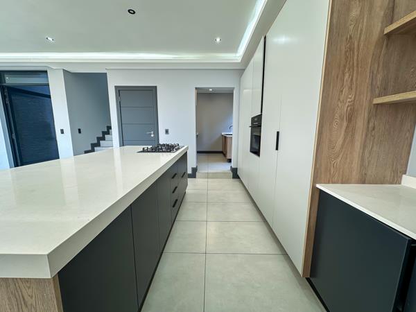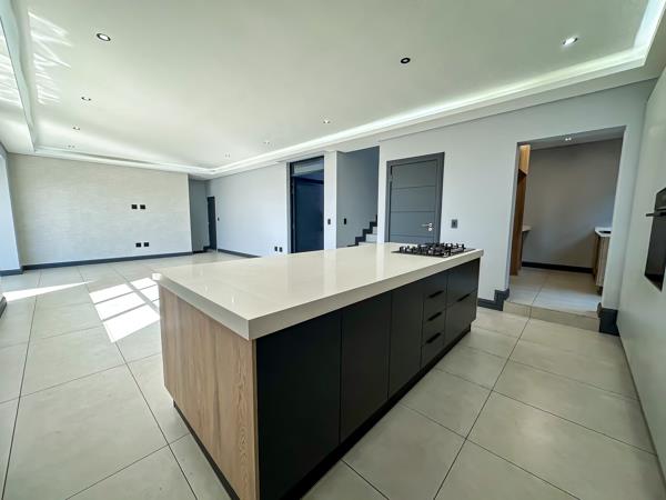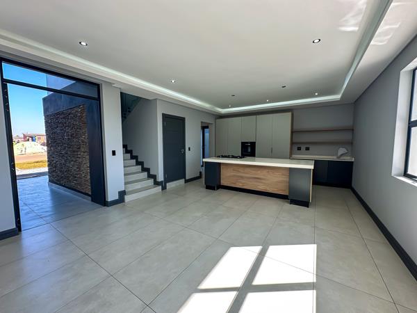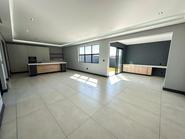 As you arrive, youre greeted by two spacious garages and ample parking for guests. Step inside to discover a light-filled open-plan living area that seamlessly connects every space. The designer kitchen features a centre island, sleek finishes, and a private scullery, flowing effortlessly into the dining area and inviting lounge.