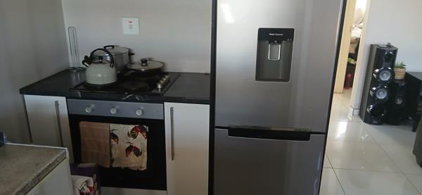 Open plan tiled living area onto a tiled kitchen with built in cupboards , stove and oven.