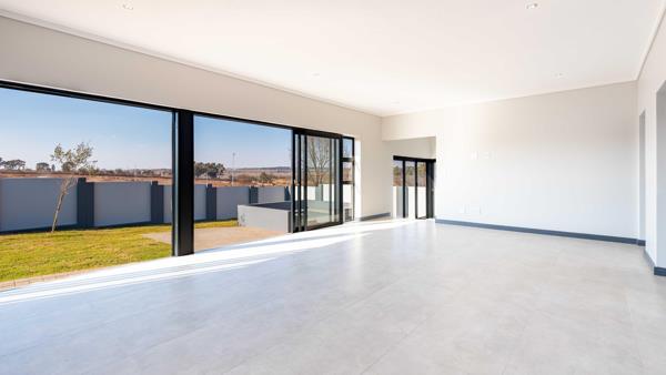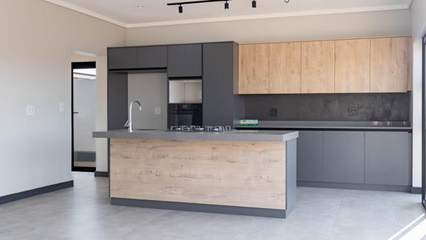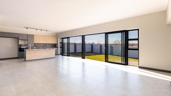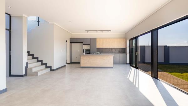 Inviting Living Area: Step through the covered porch and front door into a spacious living area that seamlessly combines a lounge, dining room, and an open-plan kitchen. The living area opens to a covered patio featuring a built-in braai and countertop with a prep bowl, perfect for entertaining friends and family.