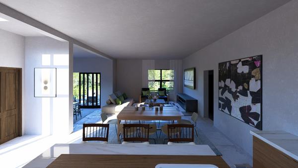 Covered patio with sliding glass doors opening to an entertainment-ready open patio