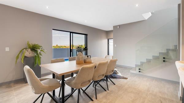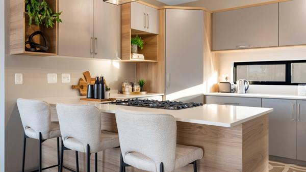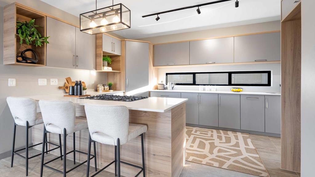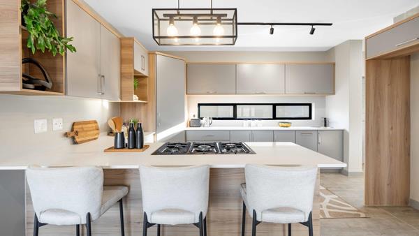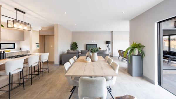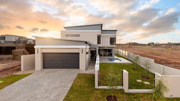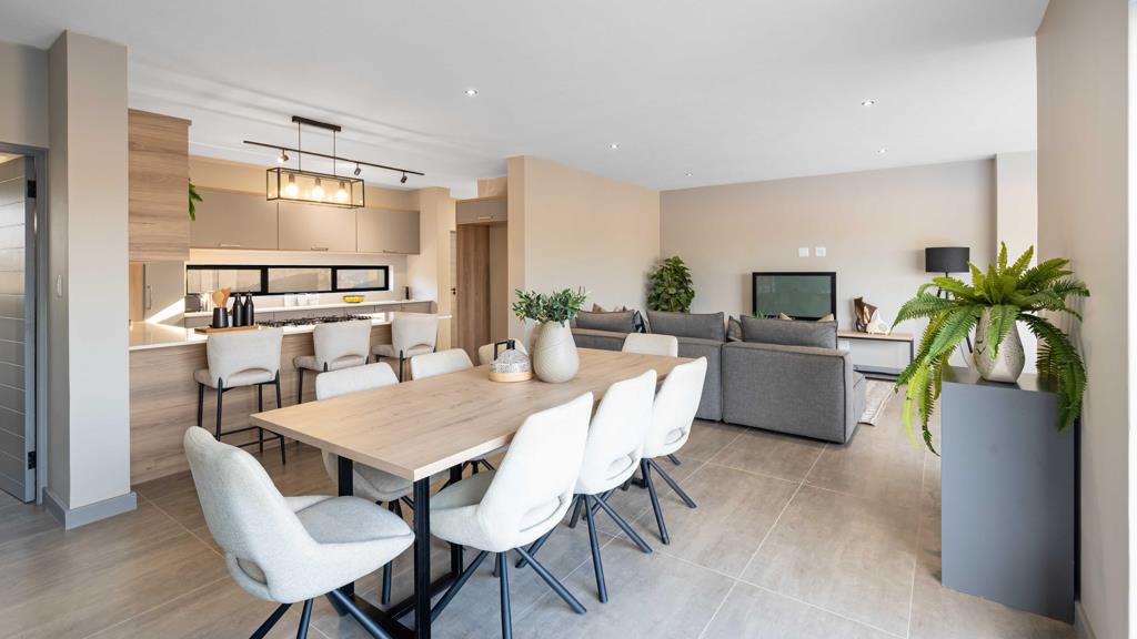 The living space extends into a dedicated entertainment area, complete with a built-in braai and countertop, perfect for hosting gatherings. Stacking doors open the space further to reveal a pool and garden, offering plenty of room to customize with additional features.
