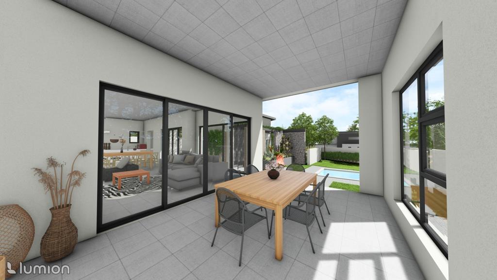 The covered patio, complete with a built-in braai, flows out to a dedicated firepit area and garden, offering ample space for future additions such as a pool or extended landscaping.
