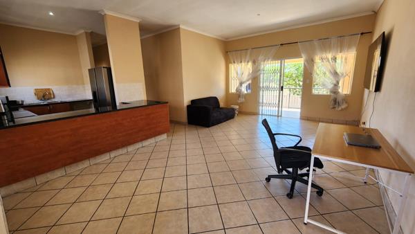 The inviting lounge area is perfect for relaxation, while the fitted kitchen offers modern convenience for all your culinary needs. The entire space is fully tiled, providing a sleek and easy-to-maintain interior.