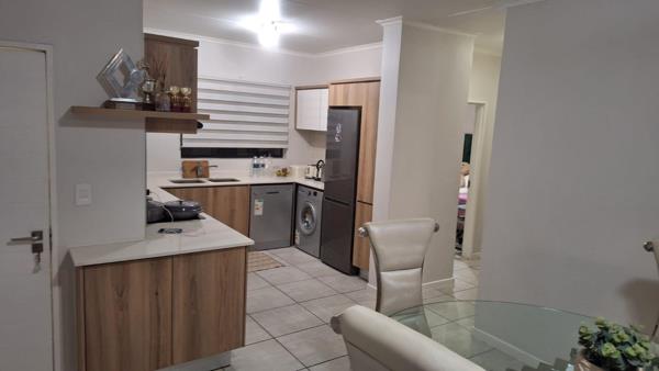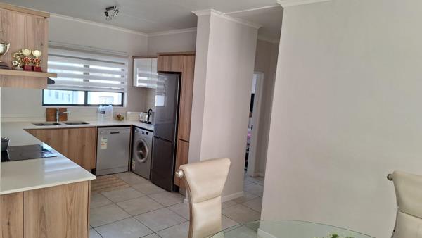 The apartment features a spacious open-plan layout, two large bedrooms with built-in wardrobes, and two modern bathrooms, including a main en-suite. The stylish kitchen comes fitted with high-end Defy appliances, including a dishwasher, fridge, and washing machine. The living area leads to a private balcony, perfect for relaxing or entertaining. Additional benefits include prepaid electricity and fiber-ready connectivity.