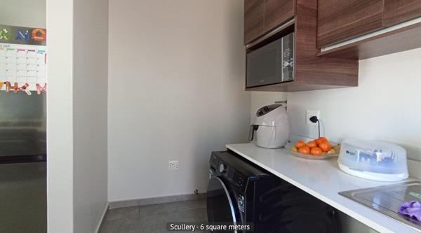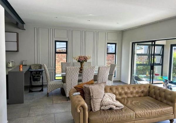 The home features three spacious bedrooms and two-and-a-half bathrooms, including a luxurious master en-suite that offers a peaceful retreat. The open-plan lounge flows seamlessly into a chic kitchen fitted with high-gloss white cabinetry and Caesarstone countertops, creating a sleek and sophisticated feel. The kitchen is equipped with a top-quality gas stove perfect for cooking during loadshedding and leads into a stylish laundry and utility area.