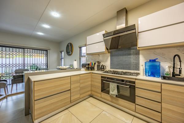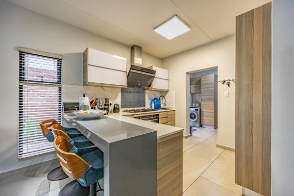 Gourmet Kitchen: Quartz countertops, two-tone cabinetry, gas hob, electric oven, extractor, breakfast bar, walk-in pantry, and separate scullery/laundry.
