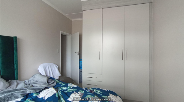 This home offers three well-proportioned bedrooms (11 sqm, 11 sqm, 10 sqm), providing comfortable private retreats. Neutral-toned walls and tiled flooring create a versatile canvas, with one bedroom including a spacious built-in wardrobe. Two modern bathrooms serve the household. A single garage and an additional parking space add convenience. Erand Gardens, Midrand, is a sought-after residential area known for its accessibility.