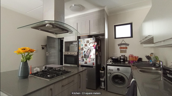 This apartment offers two comfortable bedrooms, each featuring built-in wardrobes with integrated drawers and shelving for optimal storage. There are two modern bathrooms, including an en-suite, both finished with light grey tiling, glass-enclosed showers, and wall-mounted basins. The property includes one garage and an additional parking space. Situated in Erand Gardens, Midrand, this location provides convenient access to amenities and major routes, ideal for a metropolitan lifestyle.