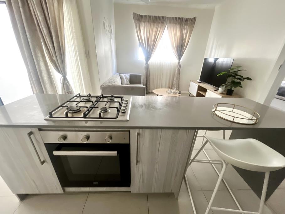 The home offers an open plan kitchen fitted with modern cupboards and a 4 plates gas stoven with a modern extractor. There''s a beautiful island where you can sit for your meals or even watch TV from there. There''s an open plan lounge and a spacious patio. The bedroom is spacious, and fitted with modern cupboards. There''s a separate bathroom with only a shower.