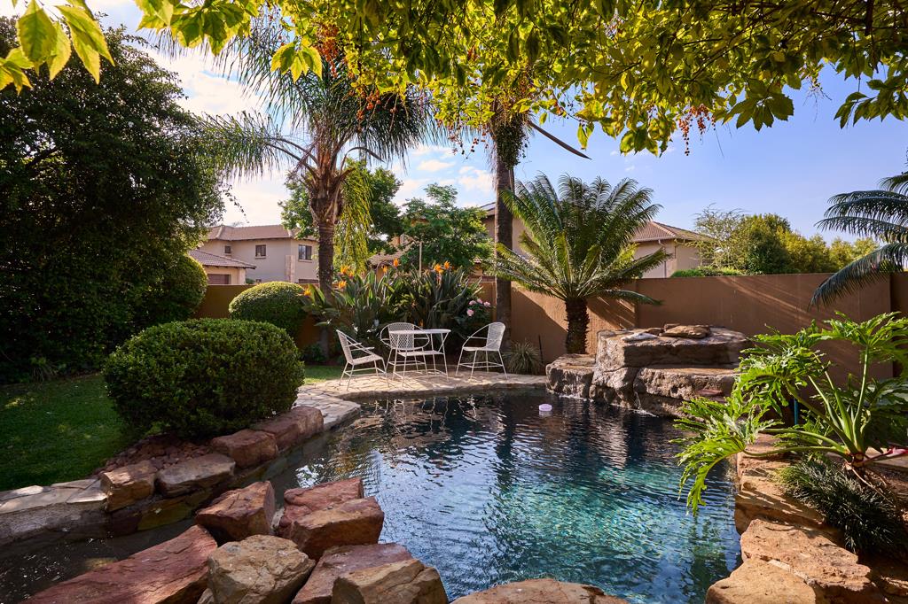 - Covered patio overlooks the lush green garden and grotto styled swimming pool.