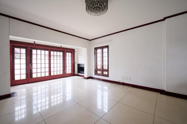 The wooden front door opens into a spacious open-plan living area. The main living areas feature soaring, double-volume ceilings with exposed, timber trusses and accents that create a dramatic focal point and infuse the space with natural warmth. The floor is laid with pristine, large-format light-colored tiles that reflect light, enhance the sense of space, and maintain a cool ambience. The living area has double doors leading out into the garden.