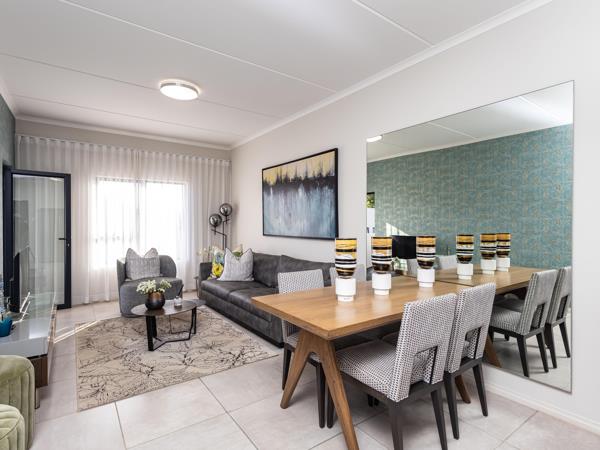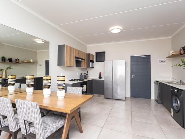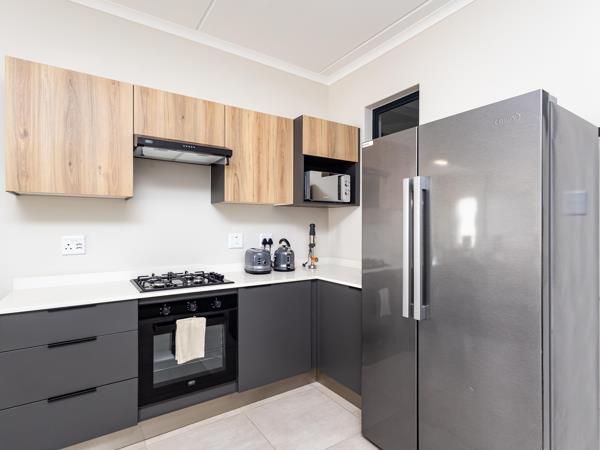 The open layout creates a welcoming atmosphere, with each bedroom offering built-in cupboards for efficient storage. The master bedroom provides a private retreat with its own ensuite bathroom, while the second bathroom ensures comfort and convenience for family or guests. The kitchen is equipped with a gas stove, powered by the estates central gas system, making meal preparation both easy and enjoyable. The unit also includes a gas geyser, ensuring you always have hot water on demand.