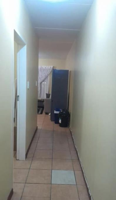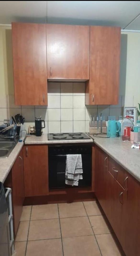 The entrance is fitted with a security gate. On the left as u come in you get the bedroom. It has built-in cupboards. Next you find the bathroom bathshower combination, toilet and basin. The living area is open plan with kitchen cupboards and under-counter oven with hob. All floors are tiled.