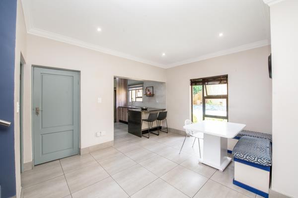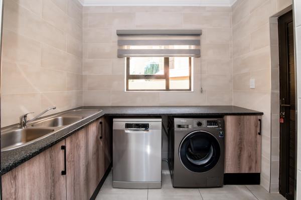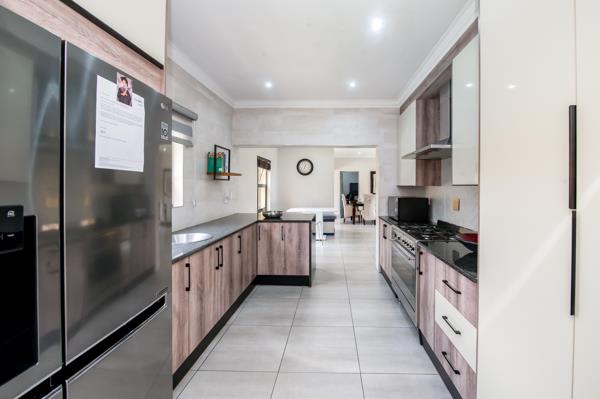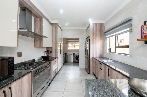 Enter through a spacious open plan lounge and dining area. The open plan kitchen has loads of cupboards space, granite countertops,gas stove, space for double door fridge and a separate scullery with space for all your appliances.