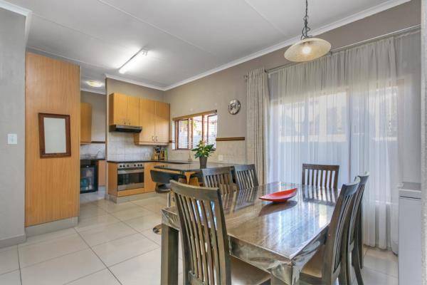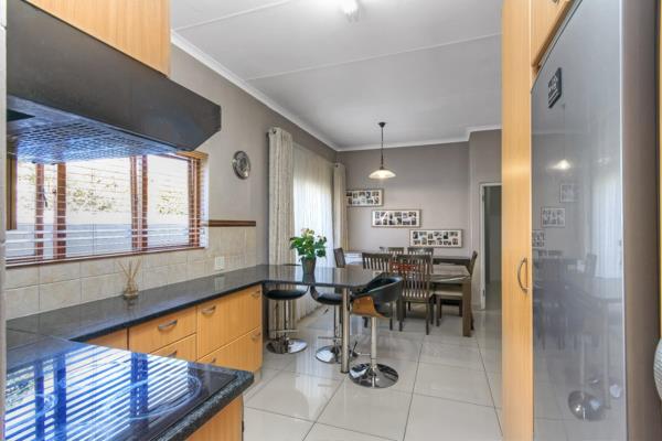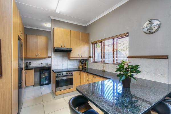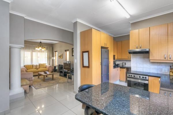 The second and third bedrooms share a full bathroom, providing comfort and convenience for family and guests. The open-plan kitchen is a highlight of the home, with a generous dining area ideal for family meals and entertaining. Adjacent to the kitchen is a practical scullery, offering additional storage and workspace to keep the main living areas tidy.